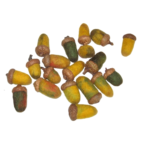 In herbstlichen Farben gefilzte Eicheln mit aufgesetztem Eichelhütchen.